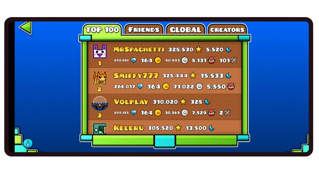 This game is not only about jumping to the beat, it also includes online multiplayer where you can race against friends or random players in real time. In the global leaderboards, you can track scores and see how you rank against other players worldwide. Like weekly demon challenges, daily levels, and player-made contests keep the game fresh and competitive. You can also share your own levels, get ratings, and follow top creators in the community. With all these features, Geometry Dash become more fun mix of challenge, creativity, and friendly competition.